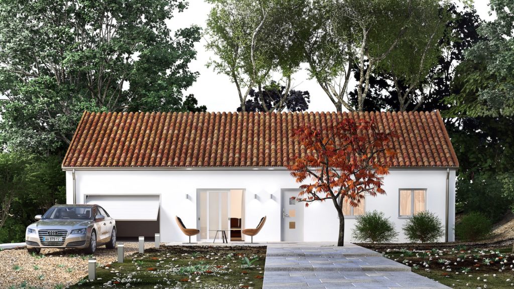 La Simply 91 est une jolie maison de plain pied avec toit traditionnel. Elle offre trois ou quatre chambres, une salle de bain et des toilettes séparées, un grand séjour avec cuisine ouverte et un cellier, pour une surface rectangulaire de 106 m² garage inclus (91m2 de surface habitable). Deux baies vitrées se font face dans le séjour, offrant une plus grande accessibilité vers l’extérieur de la maison et un éclairage naturel rendant cette maison très lumineuse.